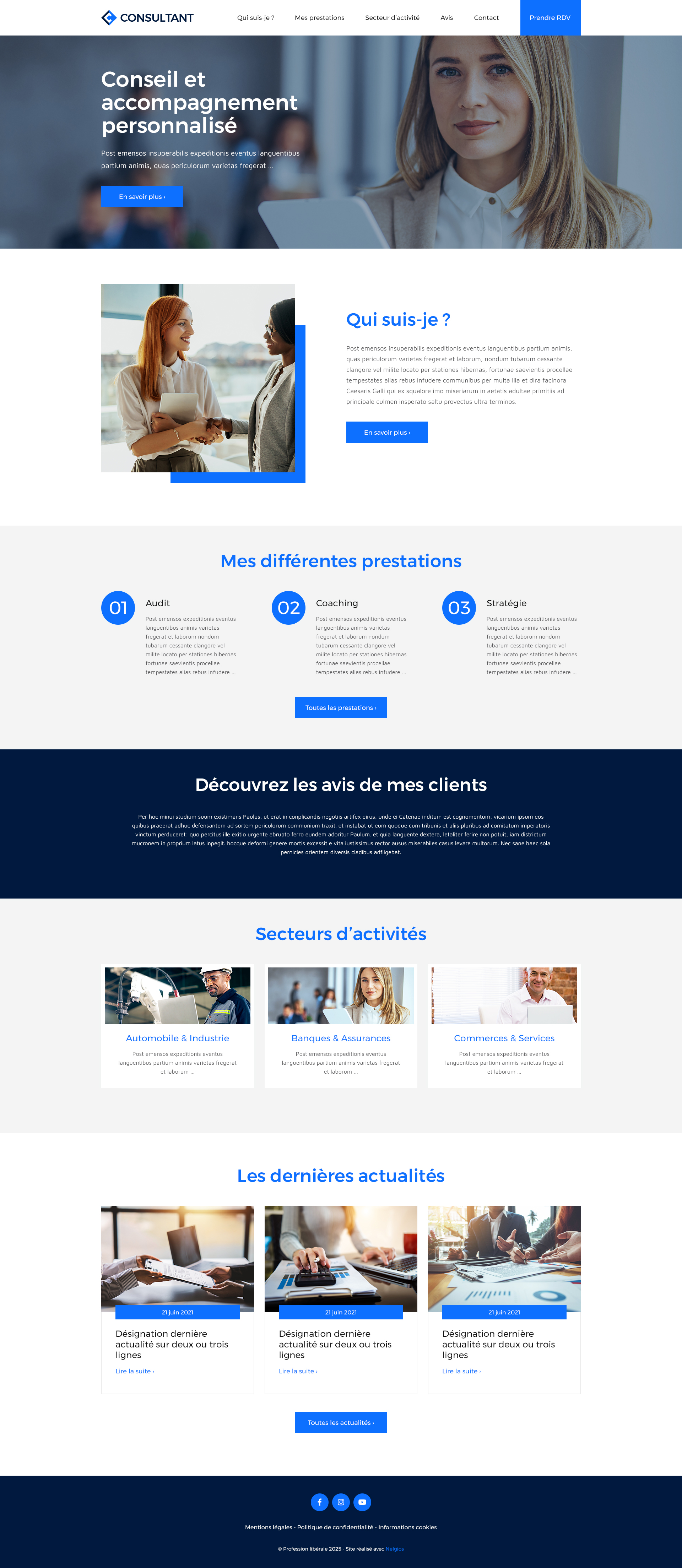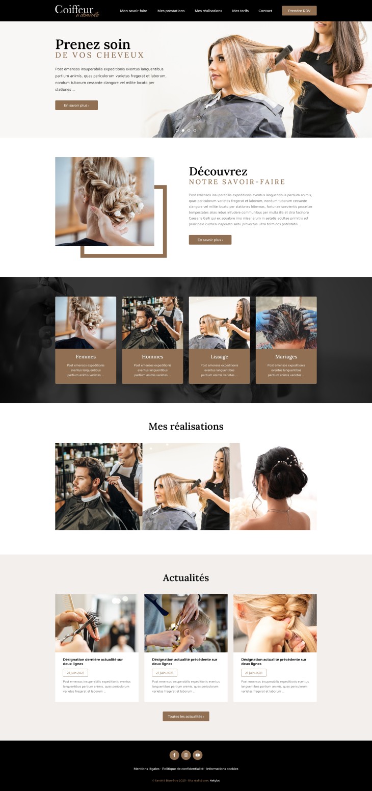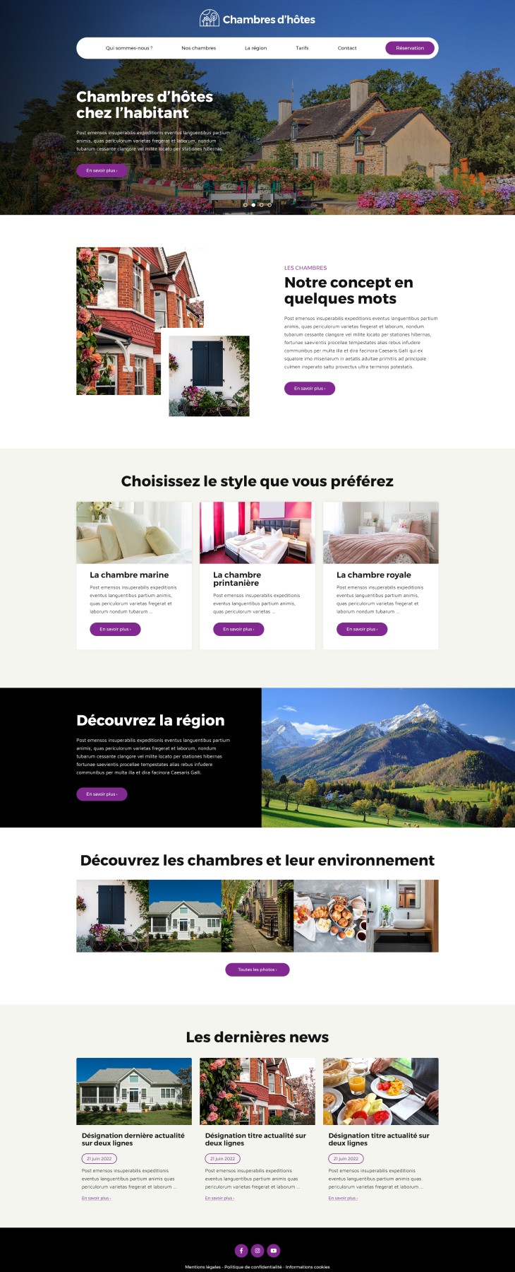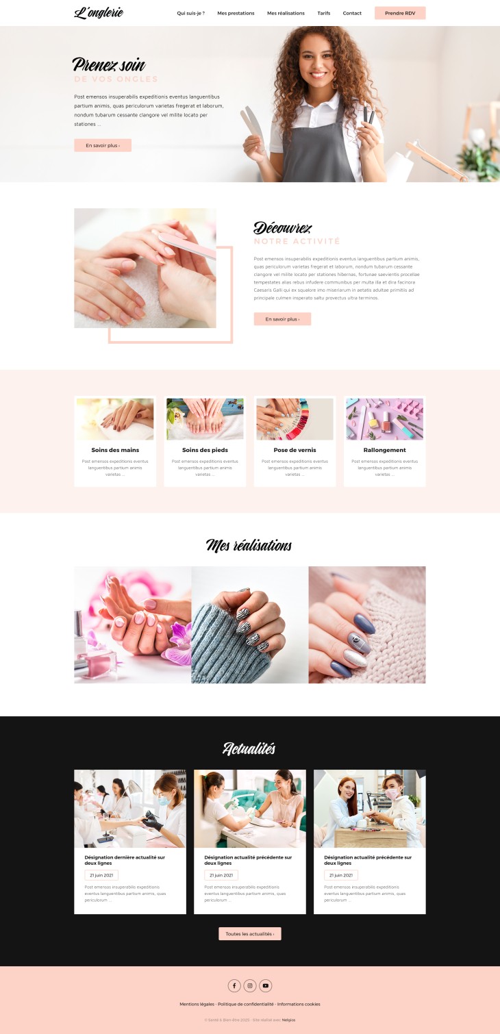 Chaque modèle peut être personnalisé selon vos préférences et vos envies : logo, couleurs de fond et de texte, typographie, contenus (textes, images, vidéos, formulaires, etc.).