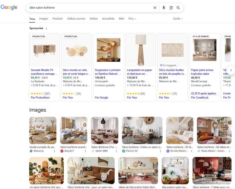 Certaines requêtes favorisent les résultats visuels sur les moteurs de recherche. Par exemple, si on tape "idée salon bohème", "aménagement jardin moderne" ou encore "décoration table de fête" sur Google, les premiers résultats naturels sont issus de Google Images. (cf. exemple)